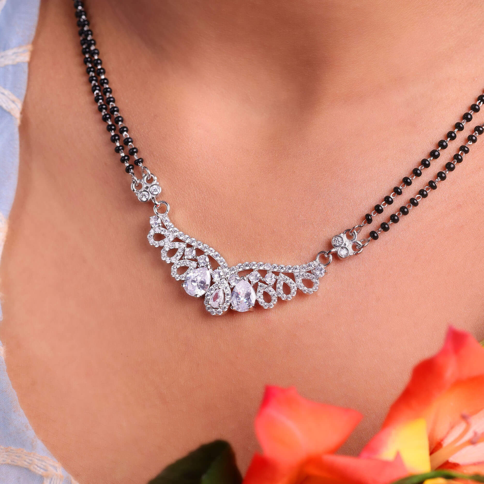 The Floral Embrace Mangal Sutra 925 Silver is a beautifully crafted piece that combines tradition with modern elegance. Designed with intricate floral patterns, the locket is embellished with sparkling CZ stones, adding a touch of brilliance to the piece. The 925 sterling silver chain ensures durability while maintaining a delicate, refined appearance. This mangal sutra is a symbol of love and commitment, featuring a unique floral design that embraces both beauty and tradition. Perfect for weddings or special occasions, the Floral Embrace Mangal Sutra is a timeless and sophisticated addition to any jewelry collection.