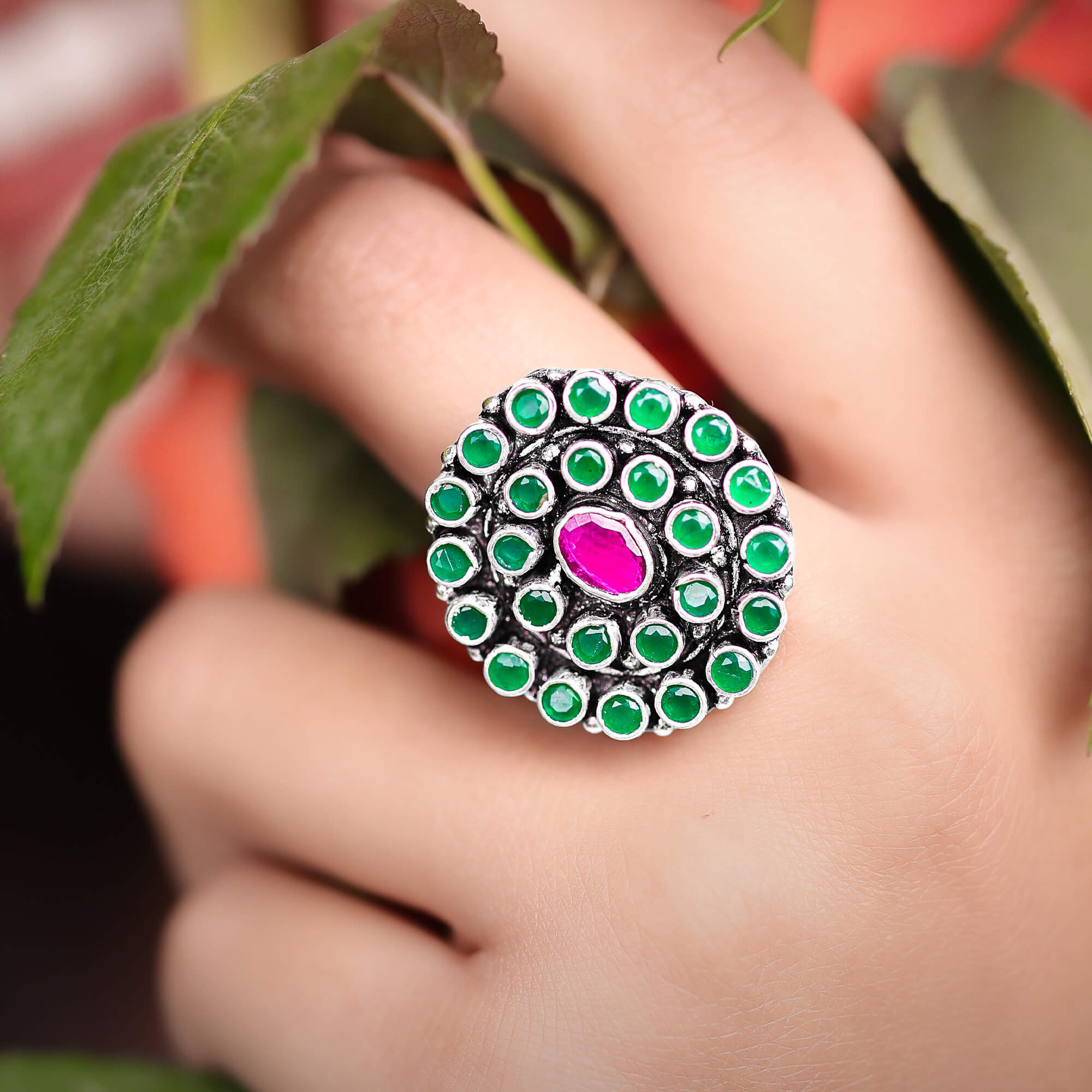 The Forest Glamour Kundan Ladies Ring is a striking 925 sterling silver piece that beautifully combines traditional craftsmanship with modern elegance. Featuring a stunning Kundan setting, this ring showcases a rich, forest-inspired design with intricate patterns and vibrant stones that capture the essence of nature’s beauty. The Kundan stones are meticulously placed, adding a radiant, luxurious appeal to the ring. The polished silver band enhances the overall design, offering a sleek and comfortable fit. Perfect for formal events or special occasions, the Forest Glamour Kundan Ladies Ring is a timeless accessory that adds a touch of opulence and sophistication to any outfit.