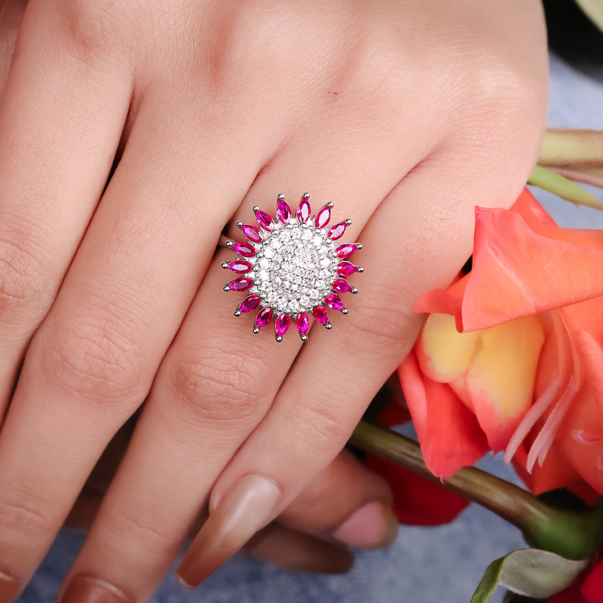 The Roseate Bloom Delight Ladies Ring is a stunning 925 sterling silver piece that captures the essence of floral elegance. The ring features a beautifully crafted rose-inspired design, with delicate petals highlighted by a soft, rosy-hued stone at the center. The intricate detailing of the flower petals adds depth and dimension, while the polished silver band ensures a smooth and comfortable fit. The combination of the rosy stone and the elegant floral motif brings a fresh, feminine touch to the design. Perfect for adding a charming and romantic element to any outfit, the Roseate Bloom Delight Ladies Ring is an ideal accessory for both casual and special occasions.