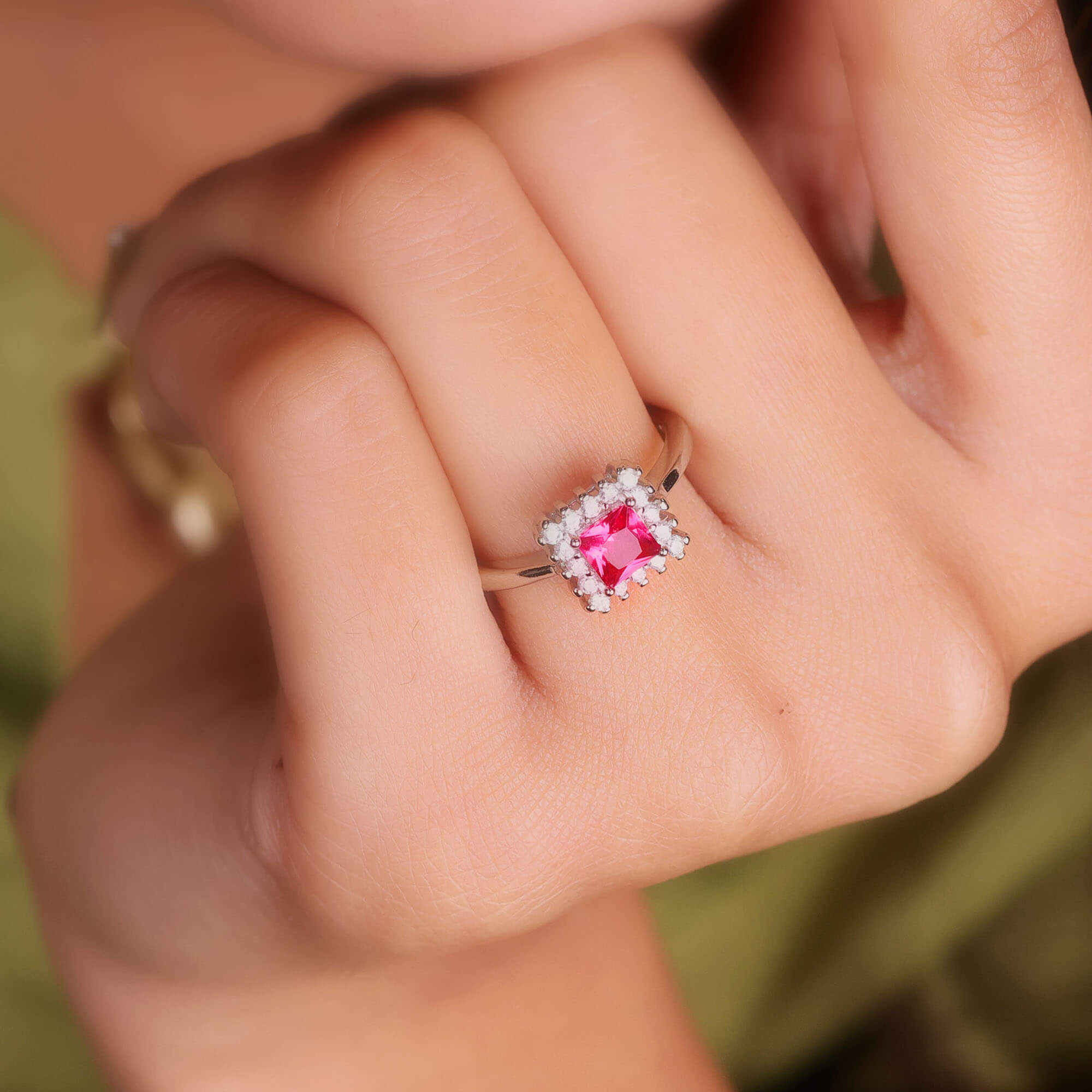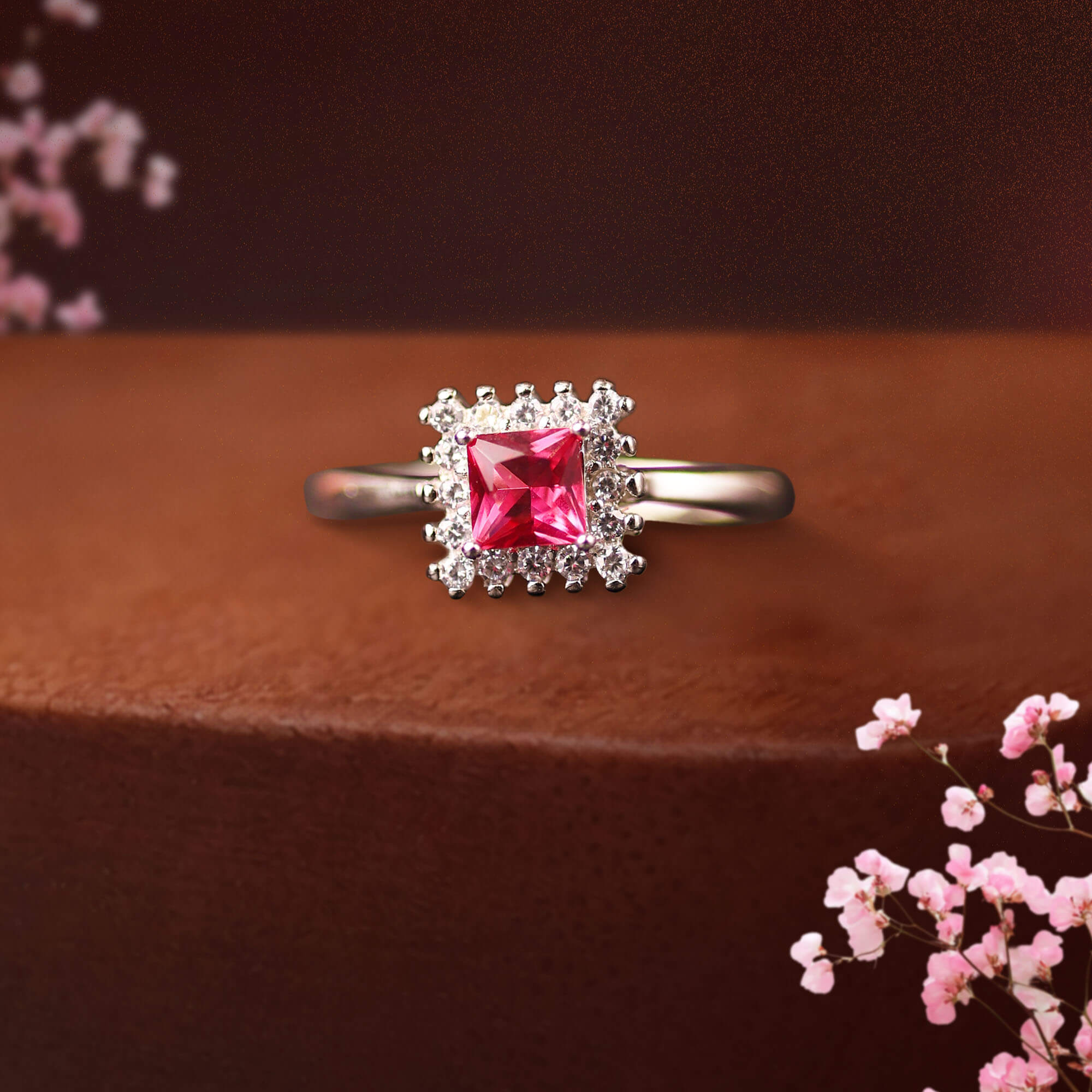 "Bold, elegant, and undeniably royal—the Crimson Royale Ring is designed to make a statement. Crafted in pure 925 sterling silver, this stunning piece features a striking square-cut red stone at the center, symbolizing passion and confidence. Surrounding it is a delicate halo of micro white stones, adding brilliant sparkle and enhancing the richness of the deep crimson hue. The geometric square design combined with radiant shimmer creates a perfect balance of modern style and timeless luxury. The finely studded band further elevates its shine, making it an ideal choice for both special occasions and standout everyday wear. Lightweight, skin-friendly, and crafted for lasting brilliance, this ring is a true expression of power, grace, and sophistication."