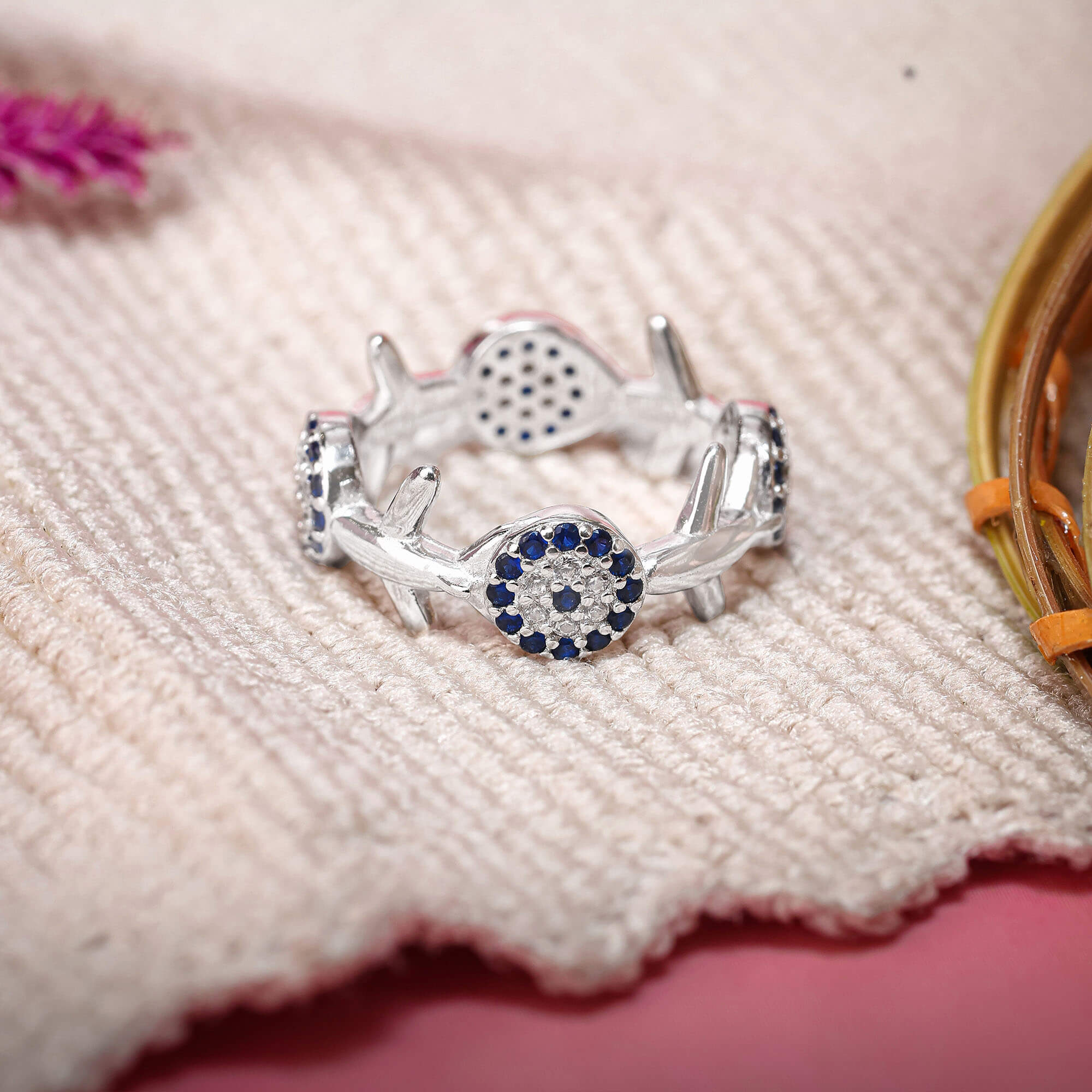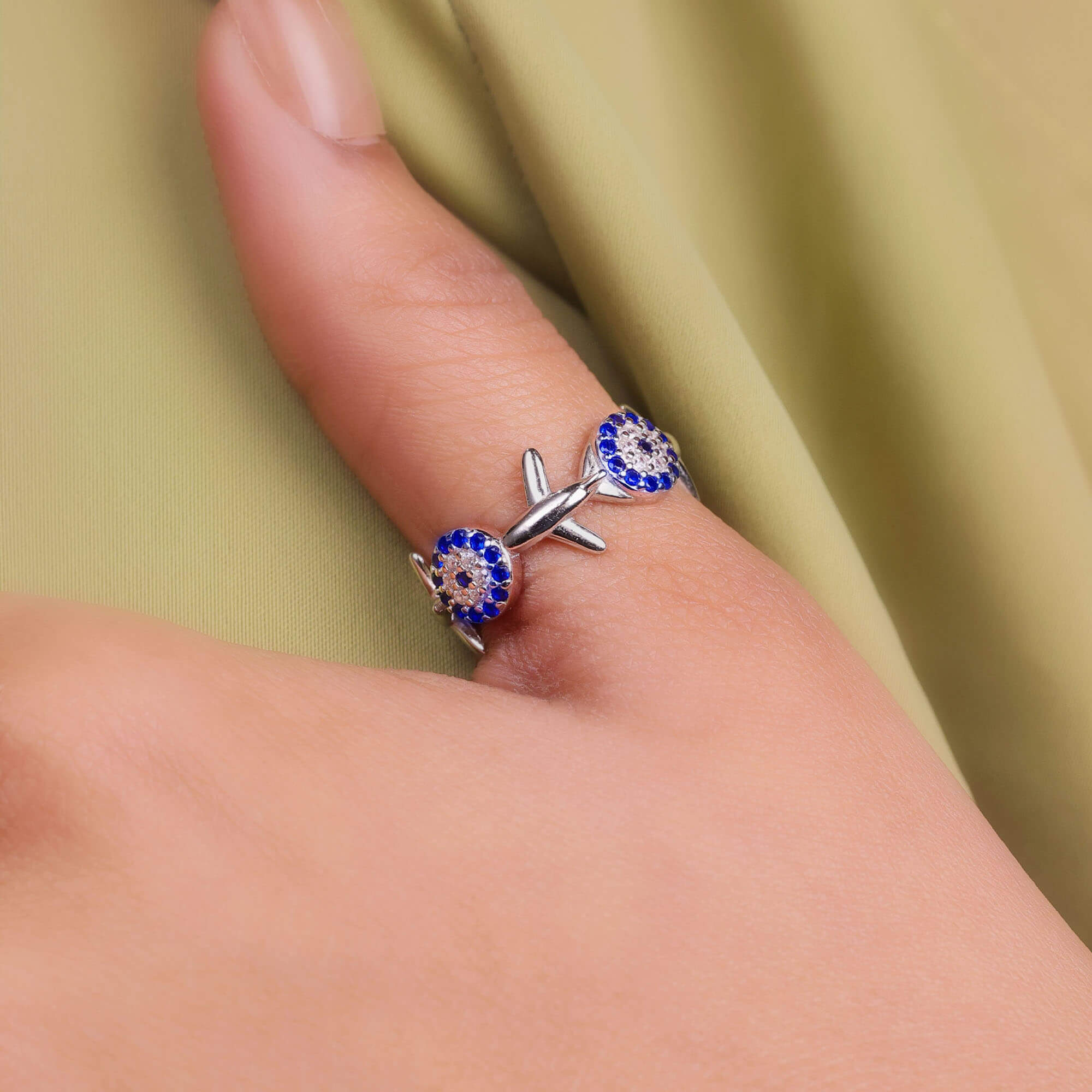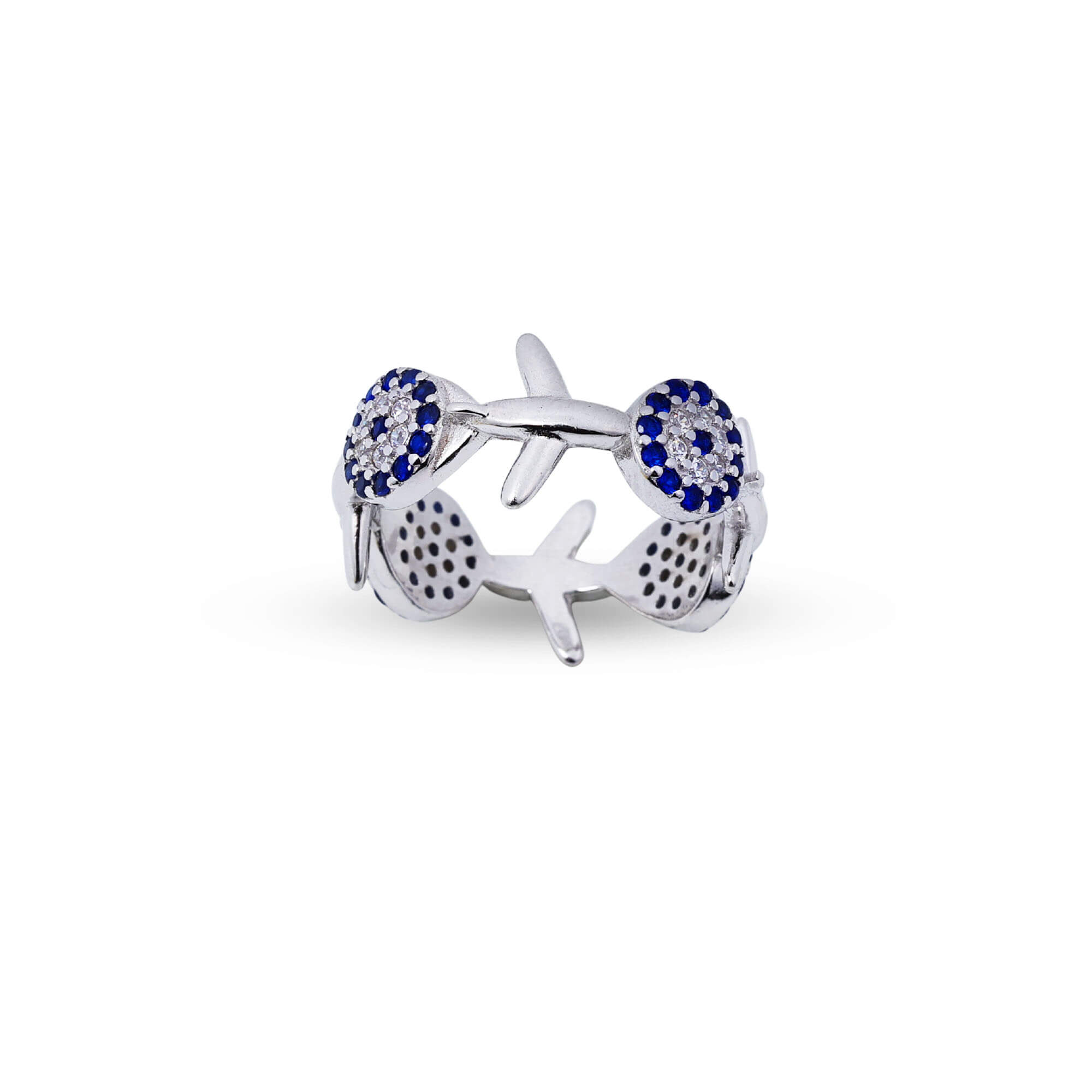 "Gracefully blending elegance with a hint of freedom, the SkyWing Spark Band is a uniquely crafted piece in pure 925 sterling silver. This beautifully designed band features delicate circular patterns of small white and blue stones spread across the ring, creating a soft yet eye-catching sparkle. Adding to its charm are subtle aeroplane wing-inspired motifs placed between the patterns, giving the design a modern and symbolic touch. The combination of cool blue tones and shimmering white stones reflects a serene sky-like brilliance, while the intricate detailing brings depth and character to the band. Lightweight, skin-friendly, and designed for all-day comfort, this ring is perfect for those who love jewellery with a story—symbolizing freedom, movement, and elegance. Whether worn daily or styled for special moments, the SkyWing Spark Band adds a refreshing and sophisticated sparkle to your collection."