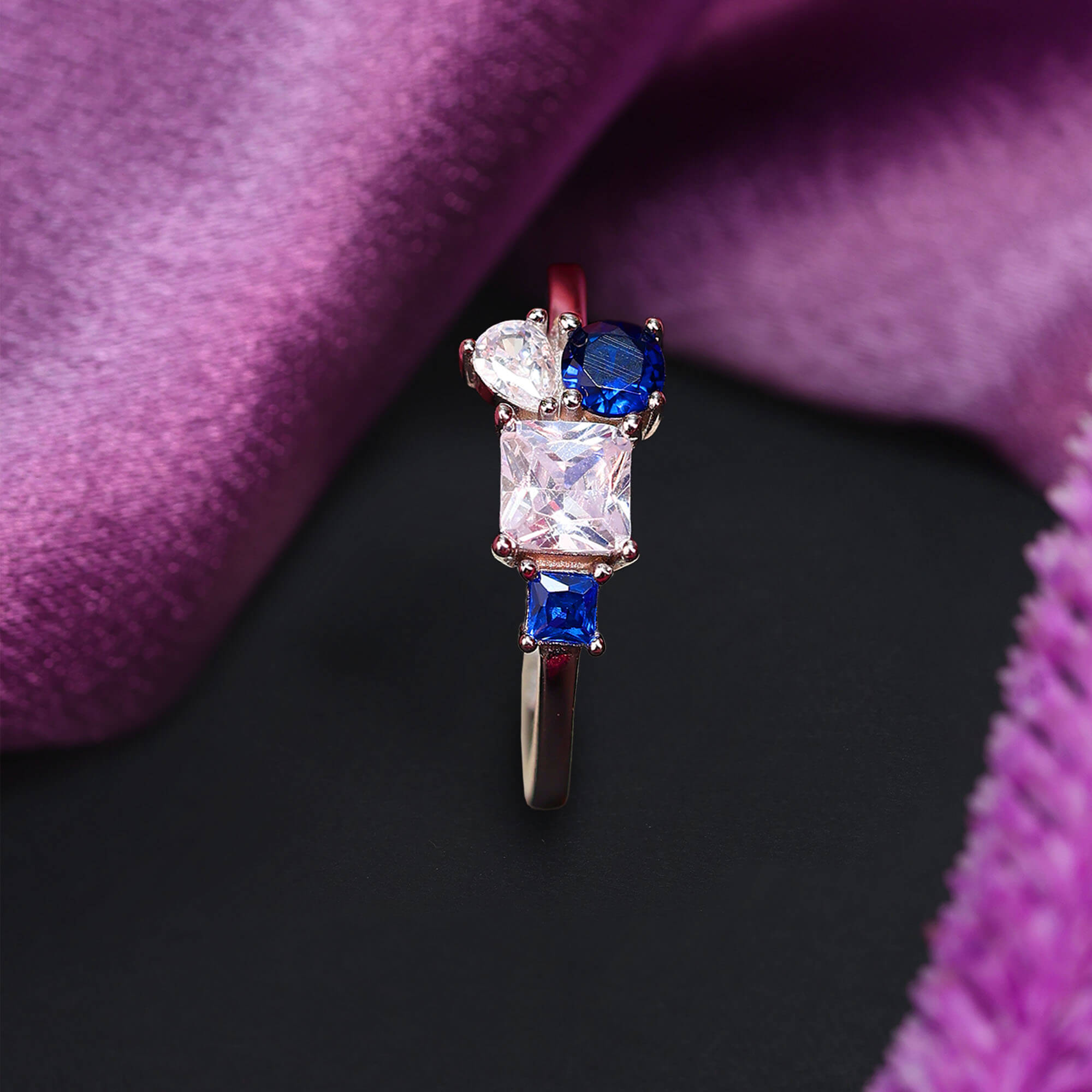 "Elegant with a modern twist, the Aurelia Offset Ring is a true celebration of unique design. Crafted in pure 925 sterling silver, this standout piece features a brilliant square-cut white stone at the center, radiating timeless sparkle. Adding to its distinctive charm, the design flows asymmetrically—on one side sits a delicate blue stone, while on the other, a graceful petal-shaped white stone paired with a round blue accent, creating a beautifully balanced yet unconventional look. The blend of crisp white brilliance and soft blue hues gives this ring a fresh, contemporary appeal, perfect for those who love jewellery that stands out subtly. Lightweight, skin-friendly, and designed for comfort, it’s ideal for both everyday elegance and special occasions. A symbol of individuality and refined style, the Aurelia Offset Ring is perfect for expressing your unique taste or gifting something truly different."
